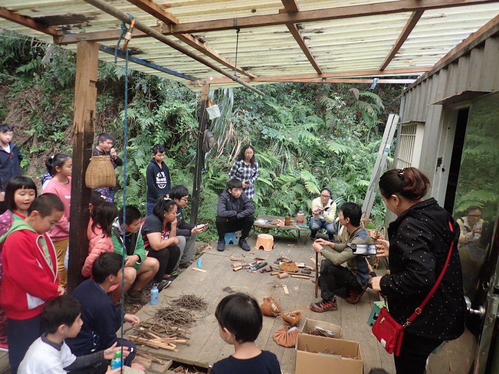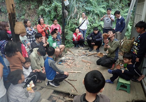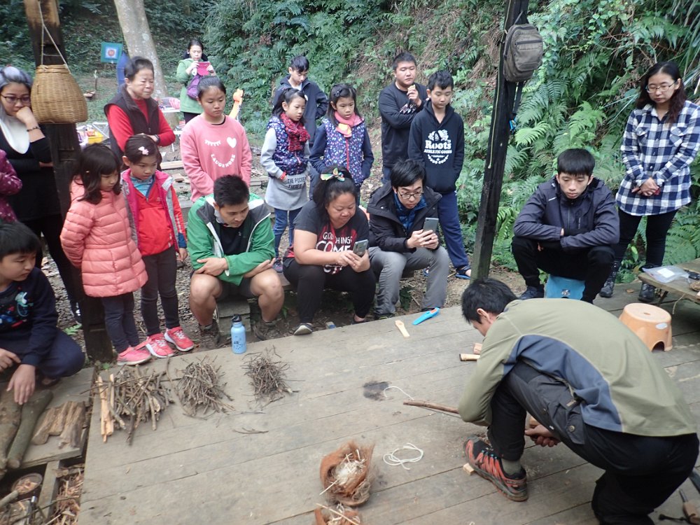這一天攀樹場擠進了50人,有人學鑽木取火,有人學基礎生火,更有十個家庭的親子放火。在火的面前, 大家好像都變成了小孩子。